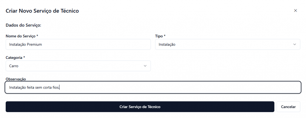 Após preencher os campos, basta clicar em “Criar Serviço de Técnico” para salvar o novo registro. Caso deseje cancelar a operação, o botão “Cancelar” encerra o processo sem realizar alterações.