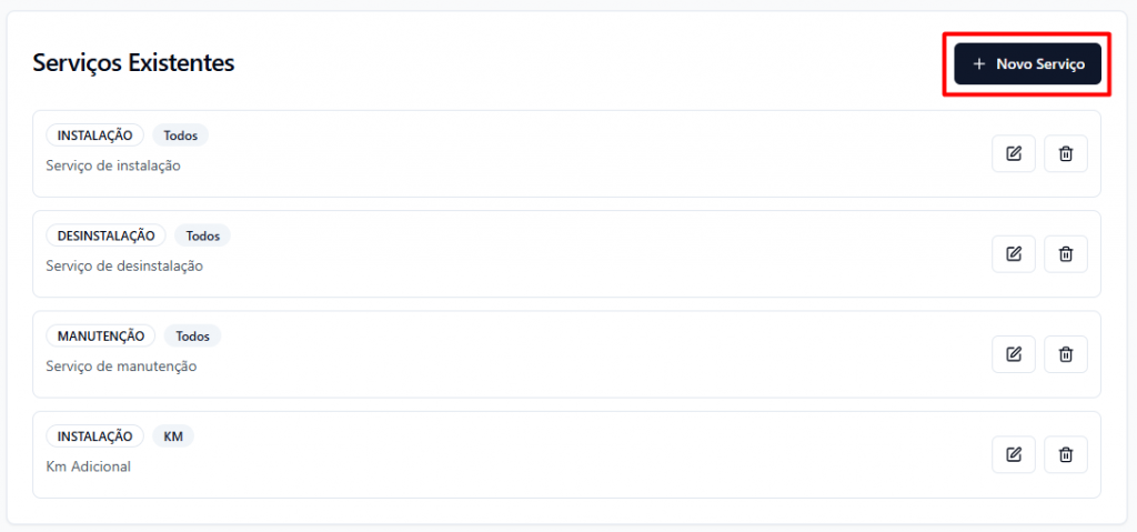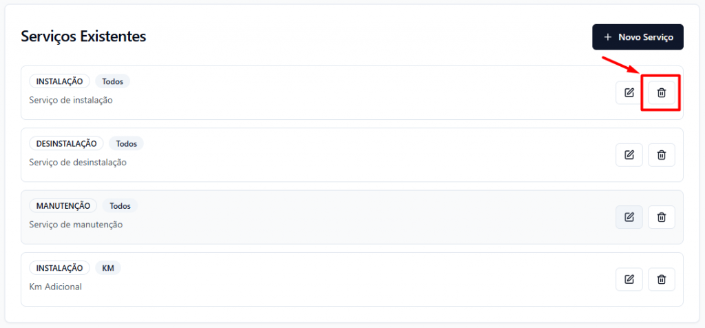 Caso seja necessario excluir um serviço existente basta clicar no icone de lixeira.