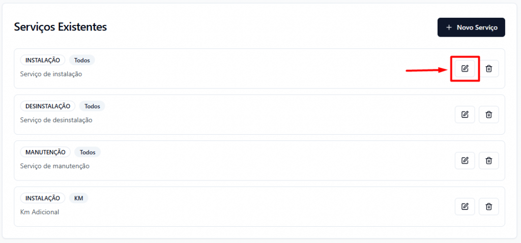 É possivel editar um serviço existente clicando em seu no icone destacado na imagem a seguir.