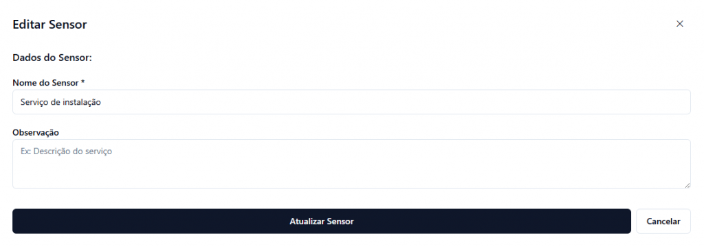 Na tela de edição do serviço, é possível atualizar as informações. Nela, você pode alterar o nome do serviço e adicionar ou modificar a observação correspondente. Após realizar as alterações desejadas, basta clicar em “Atualizar Sensor” para salvar as modificações, ou em “Cancelar” para sair sem aplicar as mudanças.