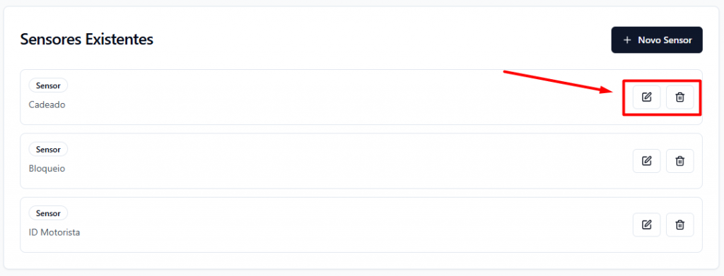 Também é possível adicionar um novo sensor clicando no botão “+ Novo Sensor”, localizado no canto superior direito da tela.