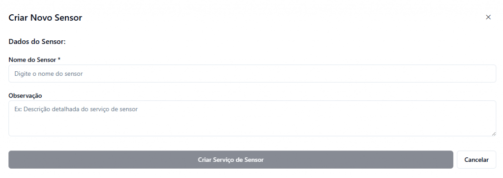 Na tela de criação de um novo sensor, você pode cadastrar um novo tipo de sensor no sistema. E para isso, basta informar o nome do sensor, que identifica o dispositivo, e preencher o campo de observação, utilizado para incluir detalhes adicionais ou observações relevantes sobre o funcionamento ou a finalidade do sensor. Após inserir as informações, clique no botão “Criar Sensor” para salvar o novo registro. Caso desista da operação, há também a opção de “cancelar” o processo.