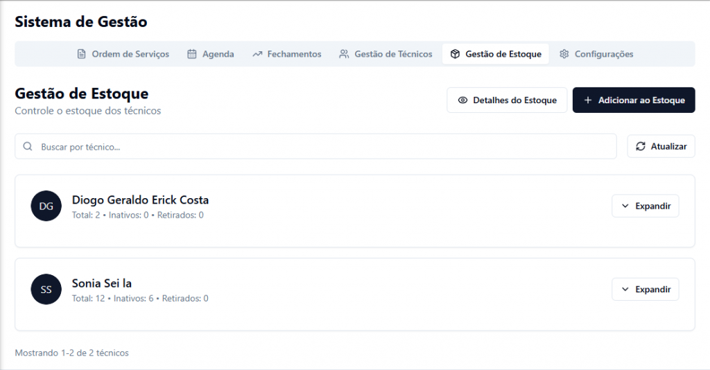 A tela Gestão de Estoque tem como objetivo permitir o controle e o acompanhamento dos rastreadores vinculados a cada técnico. Nessa área, é possível visualizar o estoque completo de rastreadores, juntamente com um resumo de seus estoques individuais, indicando o total de equipamentos.
