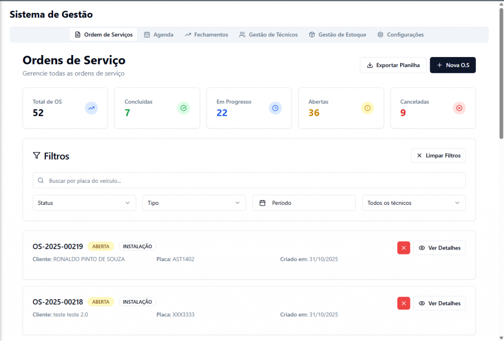 Esta tela é dividida em seis seções: Ordem de Serviço (a que está sendo apresentada), Agendamento, Fechamento, Gestão de Técnicos, Gestão de Estoque e Configuração.