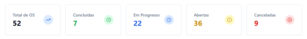 Há um dashboard que apresenta as métricas dos serviços, mostrando o total de ordens, as concluídas, em progresso, abertas e canceladas.
