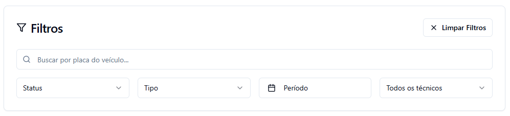 A busca pode ser realizada pela placa do veículo, além da possibilidade de utilização de filtros por status, tipo, período e técnico.
