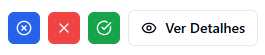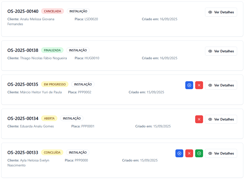 Ao lado de cada registro, há uma série de botões de ação que facilitam a gestão das ordens de serviço. O botão azul permite frustar a ordem, o botão vermelho é utilizado para cancelar a ordem e o botão verde é destinado a concluir a ordem. Além disso, o botão “Ver Detalhes” possibilita acessar todas as informações da OS.