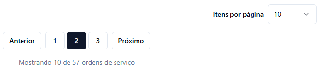 Na parte inferior da listagem, é exibido o controle de paginação, que permite navegar entre as páginas de ordens de serviço. Informa quantos registros estão sendo exibidos e o total de ordens disponíveis. É possível avançar ou retornar entre as páginas utilizando os botões “Anterior” e “Próximo”, ou selecionar diretamente o número da página desejada.