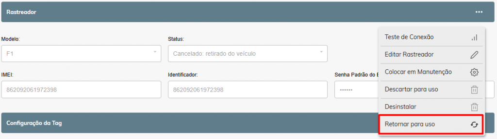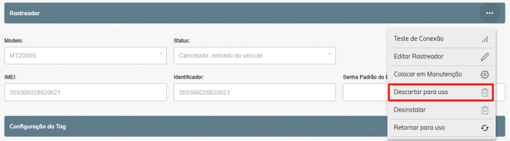 Após a desinstalação do rastreador, o equipamento pode ser descartado (Descartar para uso) caso não vá mais ser utilizado, ou então reaproveitado (Retornar para uso) em uma nova instalação.